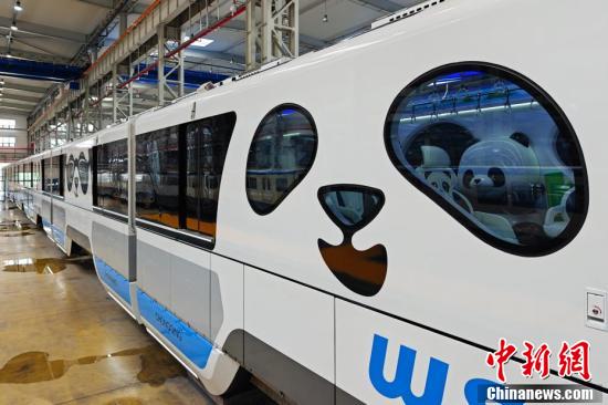 国内首列“熊猫主题”跨座式单轨列车外观。